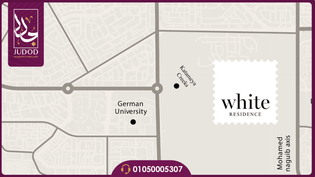 يتميز مشروع وايت ريزيدنس التجمع بموقعه الاستراتيجي الحيوي على محور محمد نجيب مباشرة و هو شريان رئيسي يربط بين أهم معالم و أحياء المنطقة و هذا الموقع لا يضمن فقط سهولة الوصول إلى الطرق الحيوية مثل طريق السويس و الطريق الدائري بل يضع السكان على بعد دقائق معدودة من الجامعات المرموقة و المراكز التجارية الكبرى مما يضيف قيمة عملية يومية لحياة السكان و يعزز من القيمة الاستثمارية للوحدات على المدى الطويل.