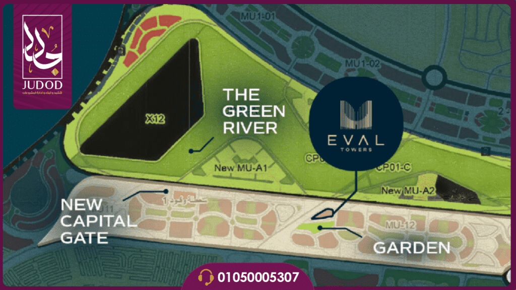 يقع مول إيفال تاورز في واحدة من أميز قطع الأراضي في العاصمة الإدارية الجديدة، حيث يُقام في منطقة MU12، مباشرة على النهر الأخضر ومحور بن زايد الجنوبي، وعلى بُعد دقائق قليلة من أبرز معالم العاصمة.