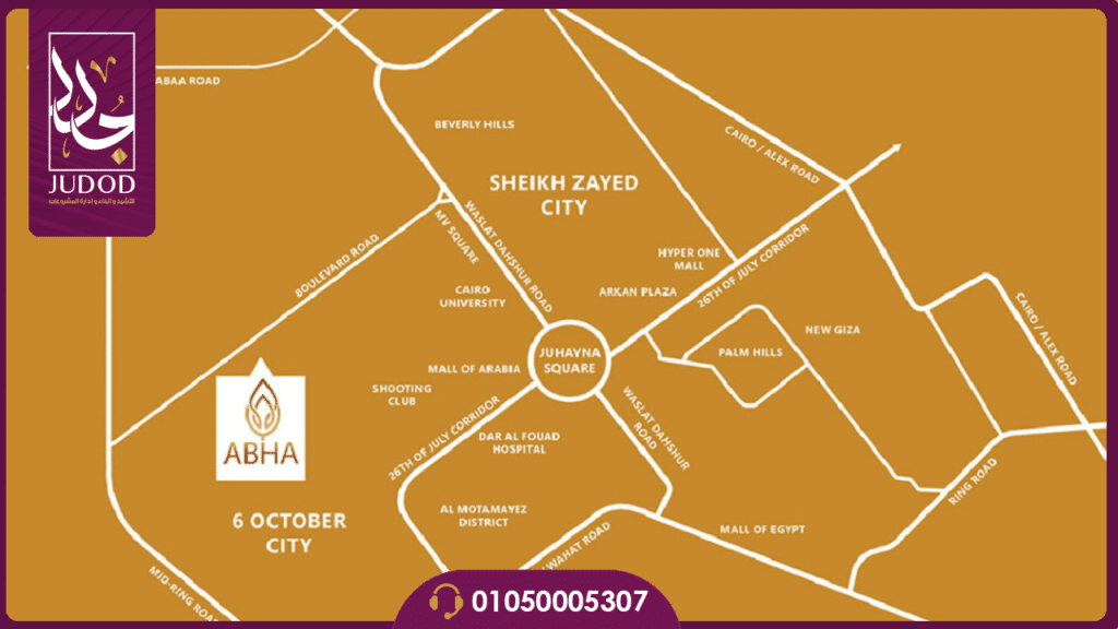 - يبعد كمبوند أبها أكتوبر 5 دقائق فقط عن محور 26 يوليو المركزي وطريق إسكندرية الصحراوي.
