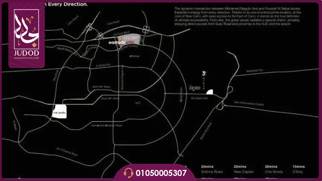 اختيار موقع مول إيست سايد التجمع الخامس لم يكن عشوائي على الإطلاق بل هو نتاج دراسة معمقة من شركة لاند مارك صبور لفهم ديناميكيات السوق و متطلبات الاستثمار الناجح و يتربع المشروع في واحدة من أكثر البقاع حيوية ورقي في القاهرة الجديدة تحديد في المواجهة المباشرة لمدينة الرحاب و هي منطقة تتمتع بكثافة سكانية عالية و قوة شرائية مميزة الأهم من ذلك يتمتع المول بإطلالة بانورامية فريدة على ثلاثة محاور رئيسية مما يمنحه واجهة إعلانية طبيعية و يضمن أقصى درجات الظهور و الرؤية Visibility للعلامات التجارية المتواجدة فيه.