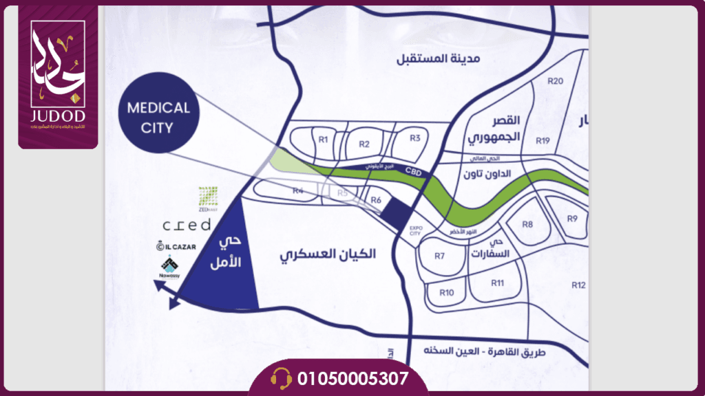 - الموقع الاستراتيجي: يقع المشروع في واحدة من أكثر المناطق حيوية بالعاصمة الإدارية، ويحيط به أحياء سكنية مكتظة بالسكان، مما يضمن استثمار مجزي للجميع.